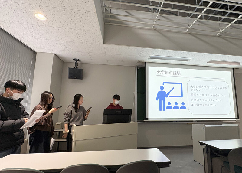 2026年1月15日(木)、小野ゼミ(3年生 8名)では、リーダーシップ開発の一環として取り組んだ課題「松本大学の国際化」をテーマに、2グループに分かれて発表を行いました。両グループとも、県内企業における海外取引や外国人雇用の増加といった現状データを踏まえ、学生側および大学側が抱える課題とのギャップに着目し、地域x国際化という視点で提案を行いました。