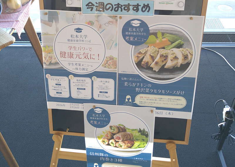 社員食堂などを運営している株式会社グリーンハウスさんからお声がけいただき、地域貢献を目指す食のイベントの一環として本学健康栄養学科の学生たちが社員食堂で提供するメニューを考案しました。地元の食材を使用し、信州の魅力を再発見できる料理となるよう工夫をこらしました。