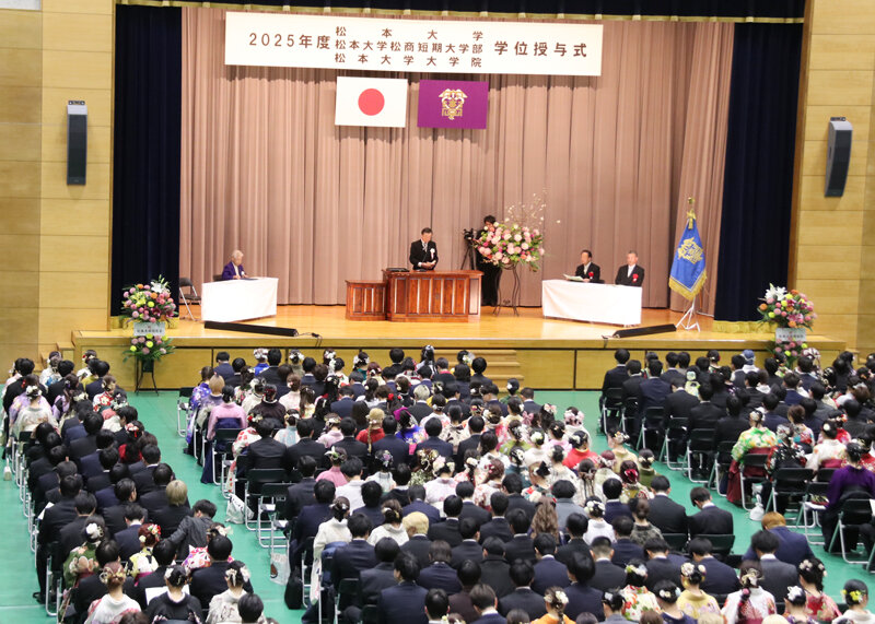 本日3月13日(金)、2025年度松本大学・松本大学松商短期大学部・松本大学大学院の学位授与式を挙行いたしました。今年度は大学院健康科学研究科3名、大学院総合経営研究科1名、総合経営学部217名、人間健康学部182名、教育学部50名、松商短期大学部165名の計618名が修了・卒業し、新たな一歩を踏み出しました。また、ご来賓および保護者の方々にも同席いただき、盛大な式を執り行うことができました。