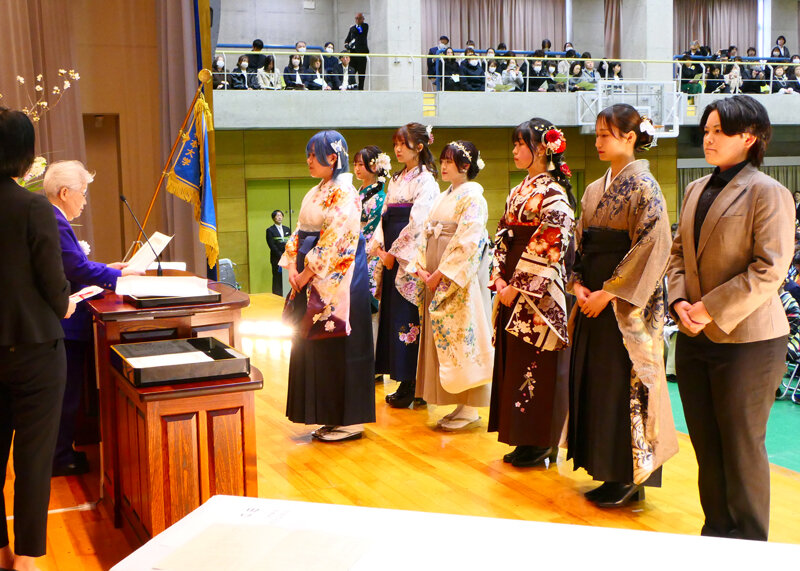 本学は、今年創立128年を迎えた学校法人松商学園の長い歴史と伝統を引き継ぎながらも、未来志向の大学として、改革と挑戦を続ける大学であります。これまでの先輩方が作り上げた「改革と挑戦のDNA」は、確実に卒業生の皆さんにも引き継がれていることと信じています。従来のシステムに疑問を持ち、思い込みを捨て、新たな価値すなわちイノベーションを創出しようとする思いも生まれたかも知れません。また、他者を尊重し、思いやりの心をもって、自律的にそして柔軟に考える力も身についたと思います。この間の皆さんの学びや活躍は、一人ひとりが「改革と挑戦」を続けてきた大きな成果であると私は考えています。