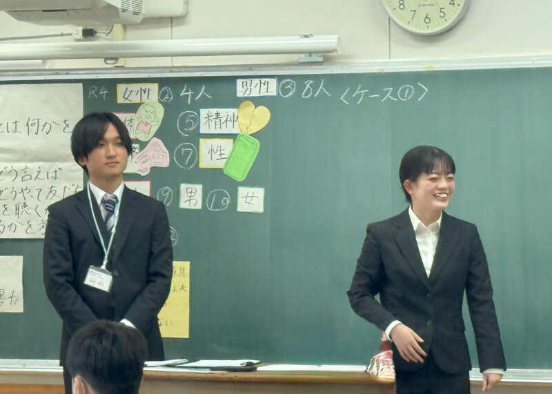 ご担当してくださった小林先生からは、「生徒たちが積極的に参加できたのは、学生さんのおかげです。」というお褒めの言葉をいただき、毎年好評の"学生からのメッセージ"の中で、『友達関係についても応用できる』と話したことにも触れ、「今日の学びがより一層の学びにつながった」とお話しくださいました。また、受講した生徒さんからは、「DVがある中、話し合いは難しいそう」、「どう対応したらいいのか考えた」、「過去に相談された内容が、デートDVだったかも」、「関わる相手を選んだ方がいい」など、それぞれの立場や経験から、問題意識を持って、じっくりと考える感想が多数寄せられました。