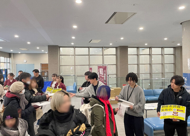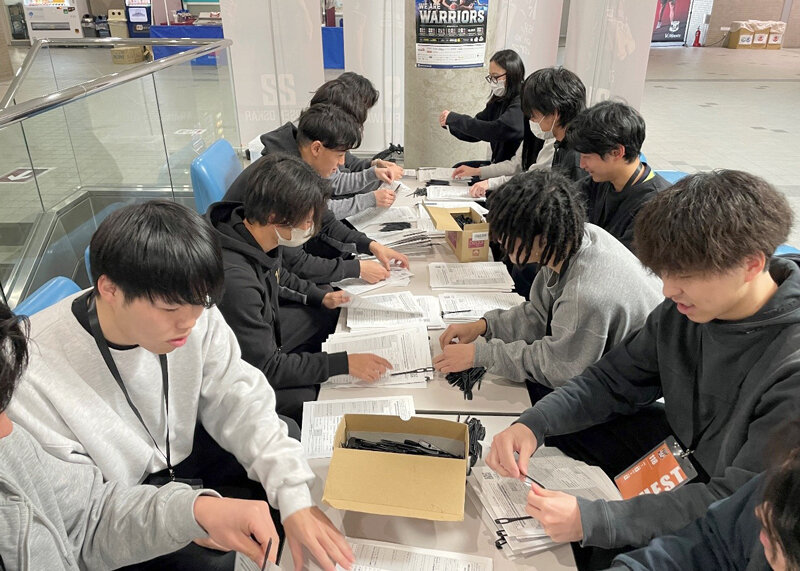 スポーツビジネスを実践的に学ぶ一環として、2025年12月、エア・ウォーターアリーナ松本(松本市)で開催されたVC長野トライデンツのホームゲームにて、観戦者調査を実施しました。この調査は包括連携協定を締結しているVC長野トライデンツに協力いただき、準備から実査、集計に至るまで本間ゼミの学生同士で行いました。活動を通して、データ収集と活用の重要性を理解することができました。