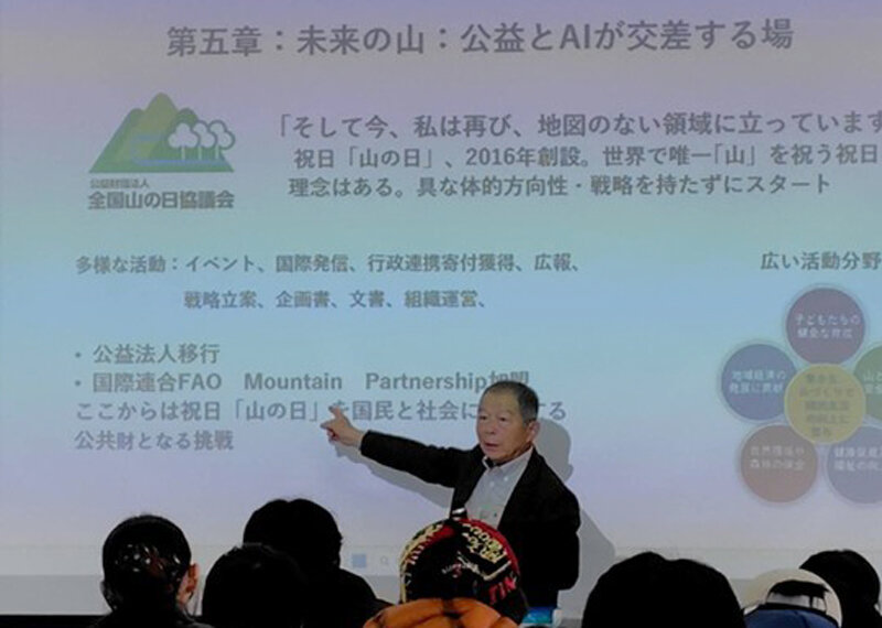 「そして今、私は再び、地図のない領域に立っています」と公益財団法人全国山の日協議会、理事長として多彩な活動に取り組まれている様子が説明されます。