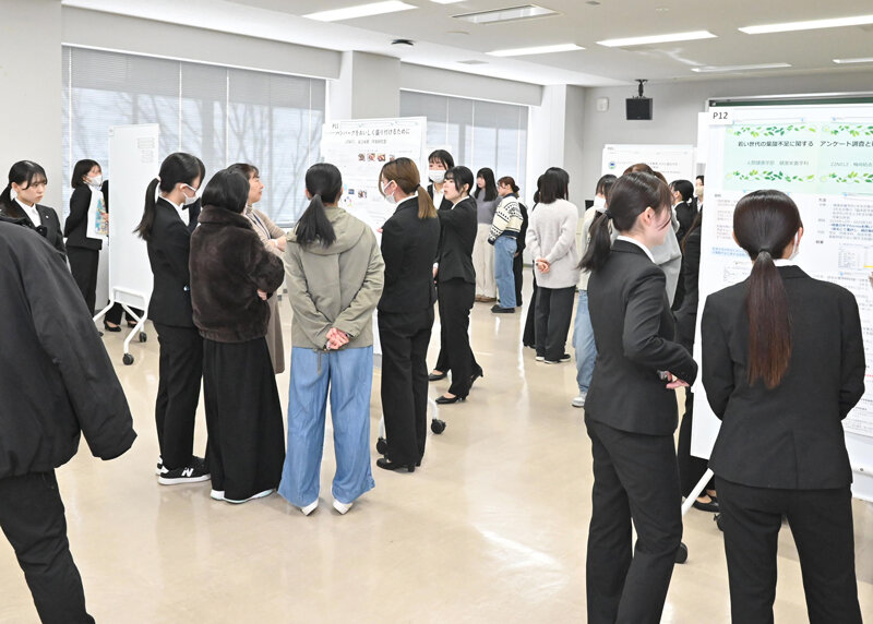 12月6日(土)、健康栄養学科卒業研究発表会が開催されました。本発表会には健康栄養学科の全学年が参加し(1年生は自由参加、2年生以上は全員参加)、口頭発表(各ゼミ1テーマ)とポスター発表を通して、先輩たちの取り組んだ研究成果を知り、学生同士が互いに学びを深める良い機会となっています。今年度は口頭13題、ポスター33題がそれぞれ発表されました。