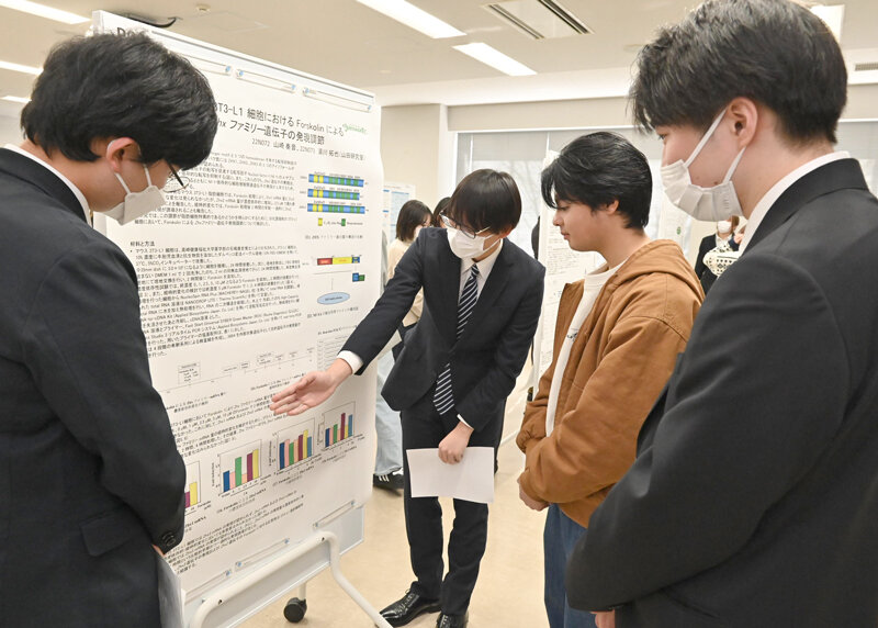ポスター発表では参加者との距離も近く、なにげない質問などもしやすい環境であることから、学生同士の質問や意見交換も盛んに行われていました。終始和気あいあいとした雰囲気で、研究内容だけでなく、それぞれの研究室の様子についても知るよい機会となっており、2年生にとってはゼミ選択をするうえで参考になったのではないかと思います。