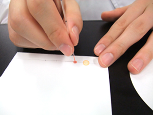 シートの下側に、鉛筆で線を引き、食品からの抽出液をスポットします。そして、シートをガラスの箱の中に入れます。箱の中には有機溶媒が入っていて、白いシートを浸すと有機溶媒がじわじわ上昇してきます(毛細管現象)。
