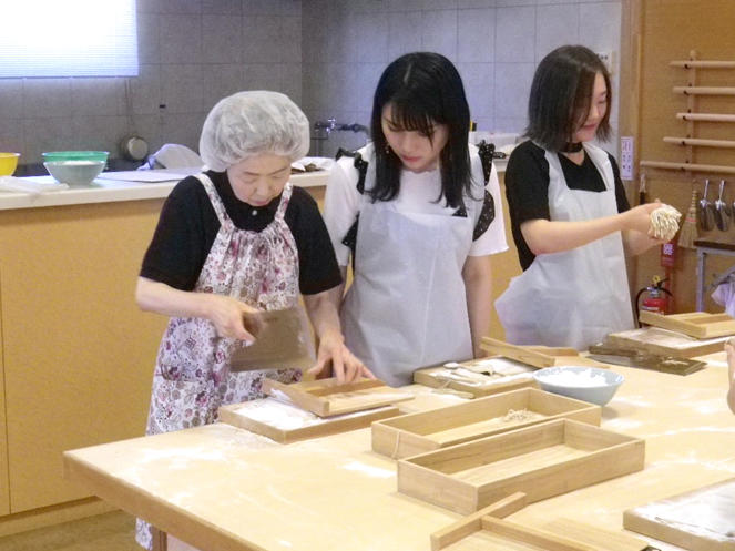 そば打ち体験は、学生各自一人前ずつ打ちました。当社生産の信州産のそば粉を、信州の天然水を使用し、水回し⇒練り⇒くくり⇒丸出し⇒仕上げのし⇒たたみ⇒切り⇒ゆでの手順を経て、そばを完成させました。初めて体験する学生も多く、思った以上に難しかったようです。各自、自分の打ったそばを食べ「美味しい」という声が多く聞かれました。