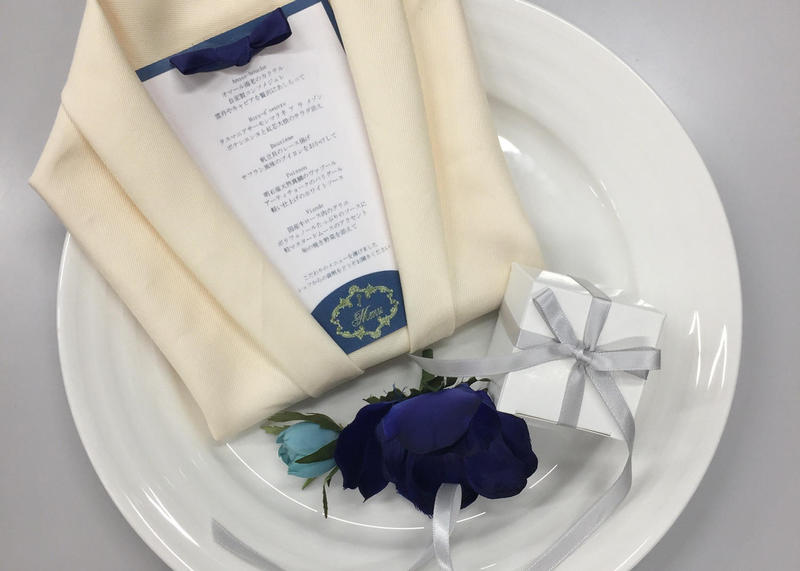 授業後学生からは、「どんな風に作るか、考えている時間やアイテム選びからワクワクして、ナプキンの折り方やリボンの結び方などイメージに合っているか、想像しながら作ることができてとても楽しかったです。」「先生にリボンの色選びにアドバイスをして頂いたり、リボンの結び方も丁寧にご指導していただき、自身の学びになりました。」「想像以上にクロスの畳み方が多くて驚きました。」などの感想が寄せられ、テーブルコーディネートの楽しさと難しさを学ぶ良い機会となりました。