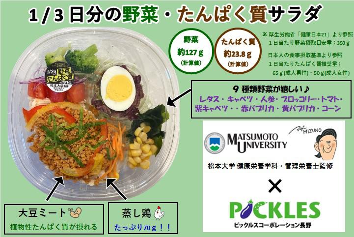 このサラダは、成人一人当たりが必要とする栄養素のなかで、とくに不足しがちな野菜とたんぱく質に着目し、株式会社ピックルスコーポレーション長野と松本大学健康栄養学科 管理栄養士(監修)がコラボレーションし、サラダを開発したものです。これをすべて食べると、1日分の必要量の1/3の野菜と1/3のたんぱく質が摂取できます。