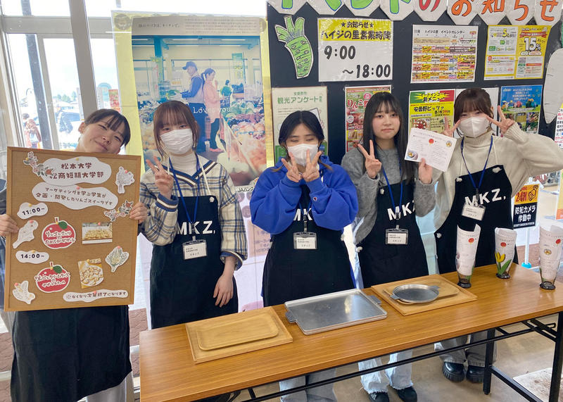 11月24日(日)に安曇野スイス村ハイジの里で開催された「りんご祭り」で、学生が考案したりんごのスイーツを作り、お客さまに振る舞いました。この日のために、ゼミナールで安曇野産のりんごを使ったおいしいスイーツを開発。