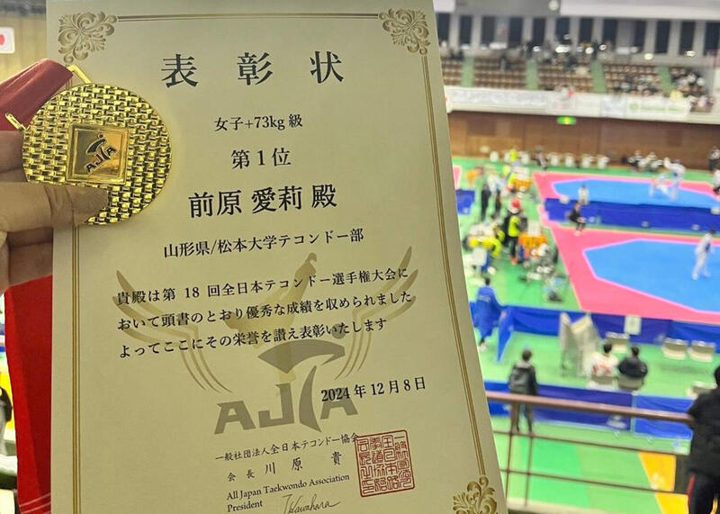国内大会最高峰の第18回全日本テコンドー選手権大会が愛知県名古屋市で開催されました。今大会は、来年度開催の世界選手権の選考会も兼ねております。本学テコンドー部からは出場権を獲得している前原選手が出場し、見事三連覇を達成することができました。