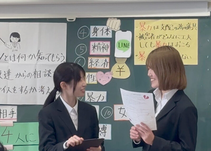 ご担当してくださった小林先生からは、「生徒たちが積極的に参加できたのは、学生さんのおかげです。」というお褒めの言葉をいただき、毎年好評の"学生からのメッセージ"の中で、『友達関係についても応用できる』と話したことにも触れ、「今日の学びがより一層の学びにつながった」とお話しくださいました。また、受講した生徒さんからは、「DVがある中、話し合いは難しいそう」、「どう対応したらいいのか考えた」、「過去に相談された内容が、デートDVだったかも」、「関わる相手を選んだ方がいい」など、それぞれの立場や経験から、問題意識を持って、じっくりと考える感想が多数寄せられました。