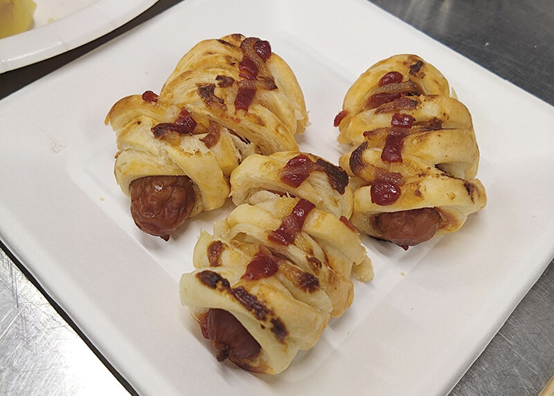 - win(ウィン)ナーパイ...みんな大好きウィンナーと勝利のwinをかけ、ウィンナーをパイ生地で包んで焼いたものです。本来ならパイは手間のかかるお菓子ですが、冷凍パイシートを使って簡単におかず風に作れるものとして提案しました。もちろんこちらも大好評でした。