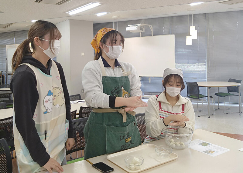 講座の運営には健康栄養学科1年生の有志9名が参加し、身体計測の補助や、補食のメニュー考案等を行いました。補食は選手やマネージャーさん達にも試食していただき、提案した3品とも大好評でした!