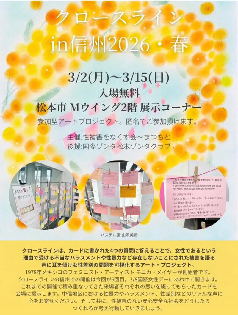 クロースラインとは、カードに書かれた4つの質問に匿名で答えることで、女性であるという理由で受ける不当なハラスメントや性暴力など存在しないことにされた被害を語る声に耳を傾け、女性差別の問題を可視化するアートプロジェクト(性被害をなくす会〜まつもと〜)です。