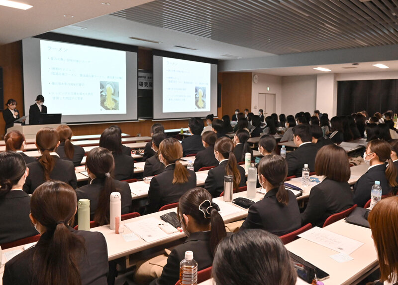 12月6日(土)、健康栄養学科卒業研究発表会が開催されました。本発表会には健康栄養学科の全学年が参加し(1年生は自由参加、2年生以上は全員参加)、口頭発表(各ゼミ1テーマ)とポスター発表を通して、先輩たちの取り組んだ研究成果を知り、学生同士が互いに学びを深める良い機会となっています。今年度は口頭13題、ポスター33題がそれぞれ発表されました。