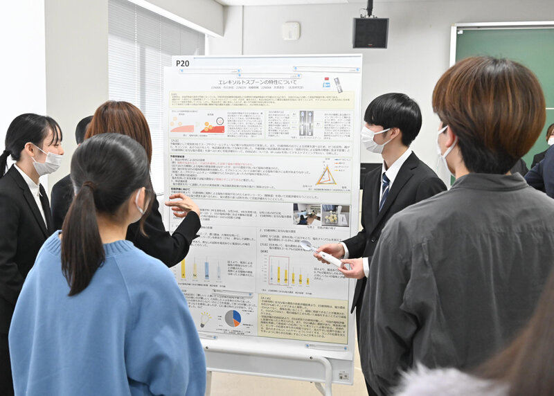 ポスター発表では参加者との距離も近く、なにげない質問などもしやすい環境であることから、学生同士の質問や意見交換も盛んに行われていました。終始和気あいあいとした雰囲気で、研究内容だけでなく、それぞれの研究室の様子についても知るよい機会となっており、2年生にとってはゼミ選択をするうえで参考になったのではないかと思います。