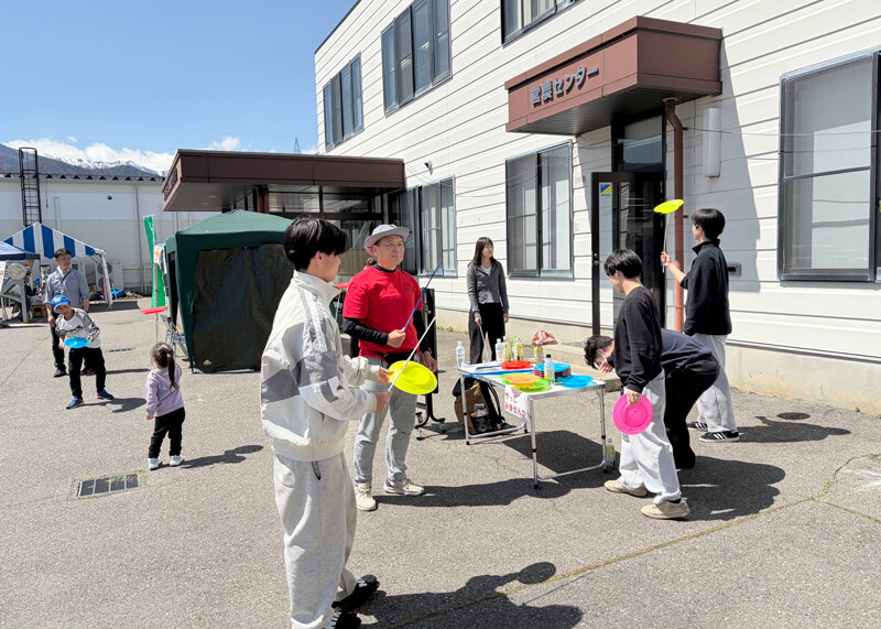 また川島ゼミの学生が、"皿回し"のレクを担当。少し風があったのでちょっと難しかったようですが、夢中になって回しているお子さんもいて、一生懸命な姿がほほえましかったです。天気に恵まれて、暑いくらいの陽気でしたが、学生たちはお客さまにお手本を見せ、回し方を教えながら、一緒に楽しんでいました。