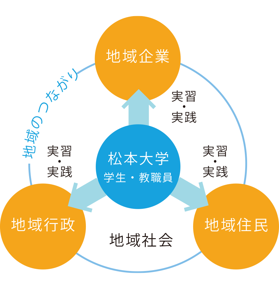 地域の「まちづくり」「健康づくり」「ひとづくり」において自治体や民間企業・教育機関と積極的に連携し、共通教養教育・専門教育で修得した知識を実社会で実習・実践することを通して、地域が求める真の人間力を養成します。